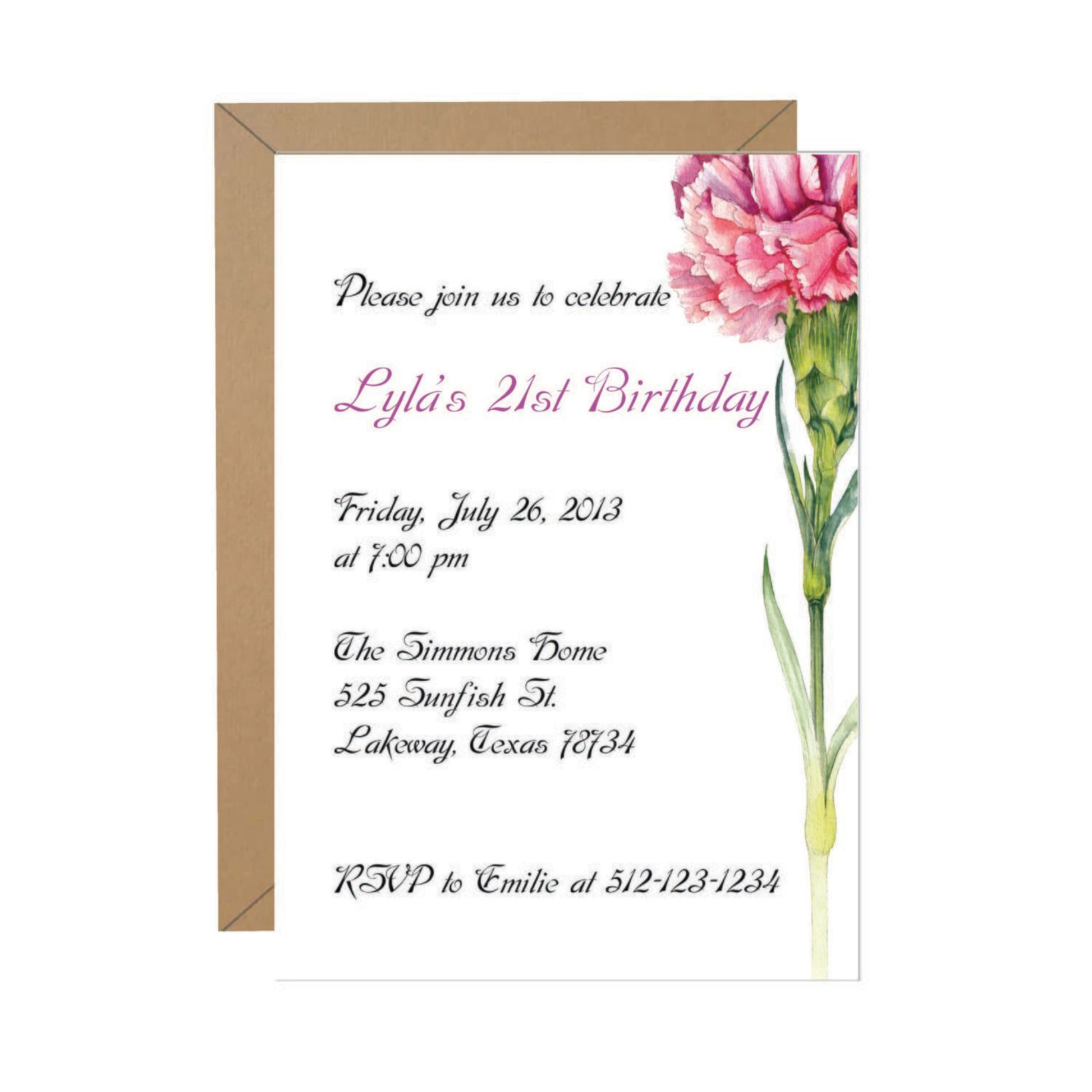 This set contains 10 single-sided 5 x 7-inch invitations printed on premium white cardstock, featuring an elegant carnation design. Each invitation is paired with a coordinating envelope, providing a refined and complete package for your event invitations. Ideal for adding a sophisticated floral touch to your special occasion.