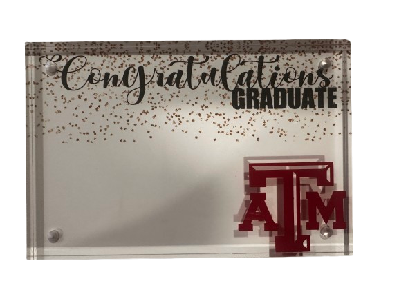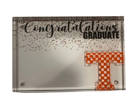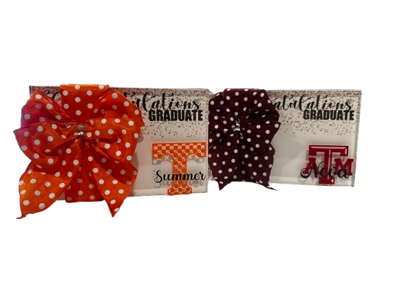 Clear acrylic magnetic photo frame 4 x 6 personalized for as a gift for a high school or college graduate. Ready for money or gift card attached to the custom designed cardstock in the frame. Wrapped with a matched ribbon.